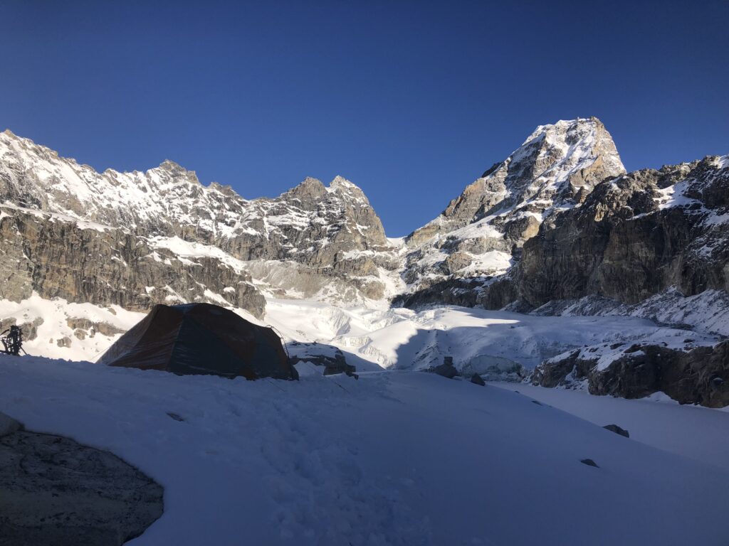 Thankfully the day dawned clear the next day and we chose to have a rest day. Around midday 2 lone figures were seen coming up the valley in our trail as the days clouds once again began to boil. It turned out to be Soren Ledet and Lakpha Tamang – two good friends of mine and whom I’d last seen in 2016 on CHOLATSE. It was amazing to see them however they quickly turned around after dropping of a load of gear and want back down towards BC to allow Soren to Acclimate.
